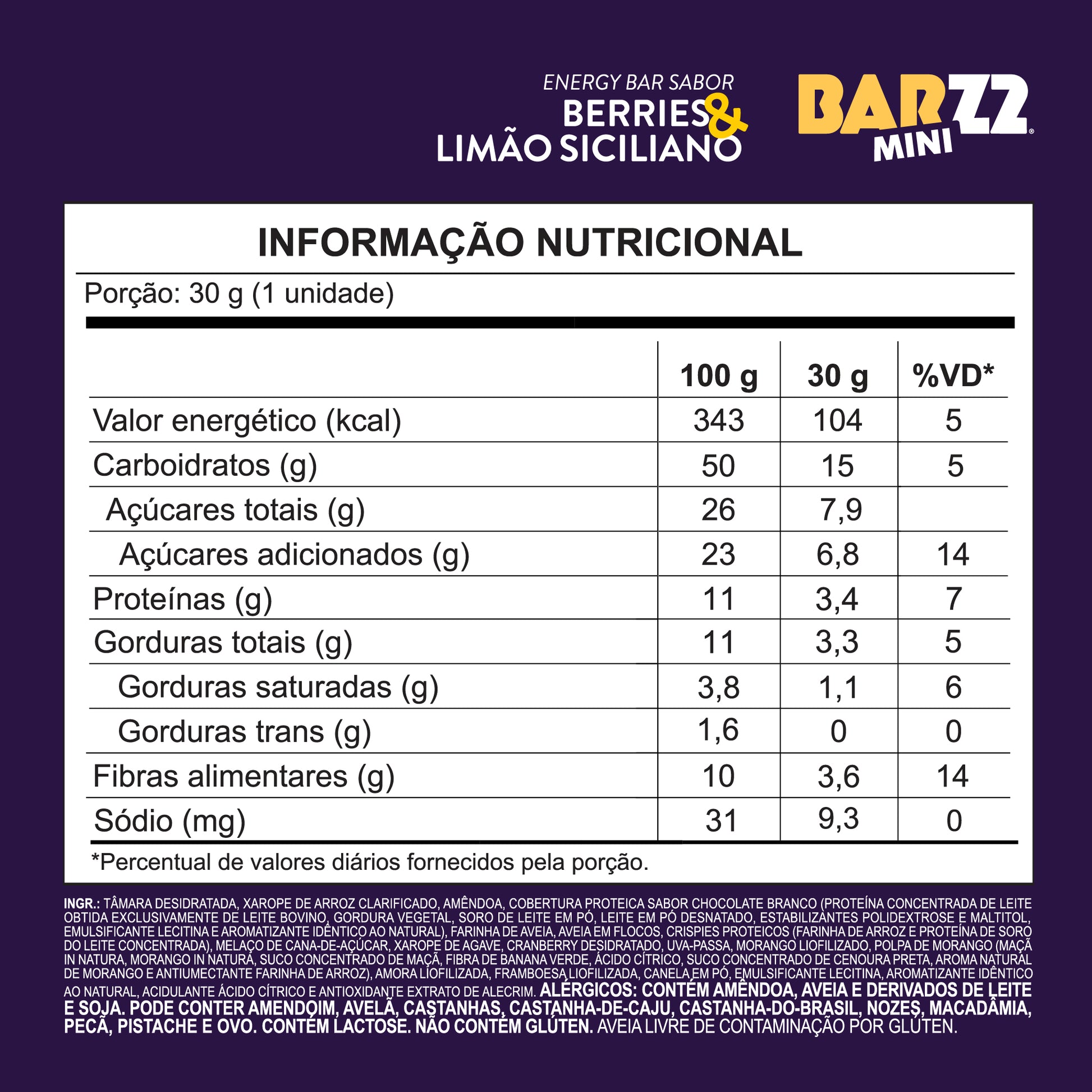 No sabor Berries & Limão Siciliano, combina ingredientes como tâmaras, amendoim, aveia, proteínas do leite e frutas, entregando um perfil de sabor refrescante e equilibrado. A versão de 30g mantém valores nutricionais proporcionais à barra de 60g, reforçando consistência dentro da linha.